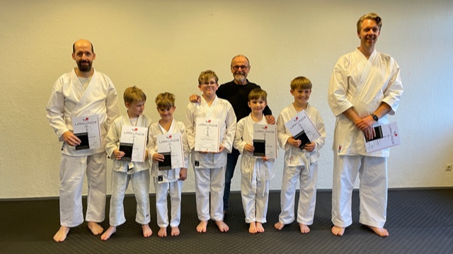 Kurz vor Ostern war es soweit, unsere Karateschüler aus dem Anfängerkurz 2025 haben ihre erste Prüfung zum weißen Gürtel absolviert. Zum ersten Mal haben wir den Kurs für Kinder und Erwachsene ab fünf Jahre gestartet. Der Zulauf übertraf alle unsere Erwartungen. Das Schöne war, dass sich mit den Kindern auch die Eltern in der Halle einfanden. Somit gab es eine schöne Mischung aus Jung und Alt an Trainierenden. Nach vielen Trainingsstunden stellten sich die Anfänger mit ihrem Erlernten dem Prüfer. Dieser hatte nichts auszusetzen, sodass alle Kinder und Erwachsenen ihre Prüfung bestanden. Wie der Weg im Karate nun weitergeht, sahen alle an einem Schüler, der seine Prüfung zum Gelbgurt ablegte. Nun konnten alle voller Motivation in die Osterferien gehen und sich auf die nächsten Trainingseinheiten freuen.